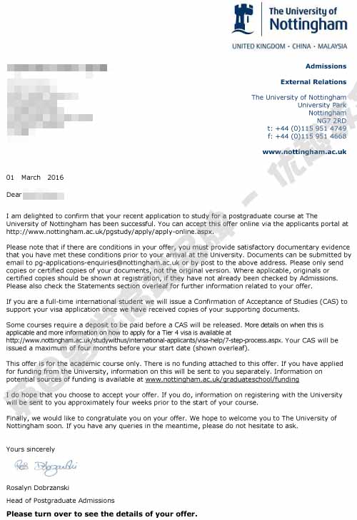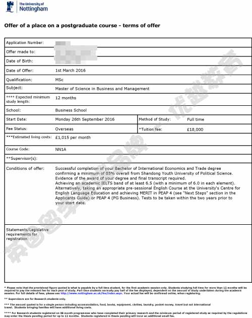 恭喜刘同学获得诺丁汉大学商业管理专业硕士通知书