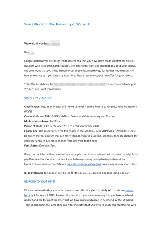 2019offer:恭喜张同学获得华威大学商业会计与金融专业硕士通知书