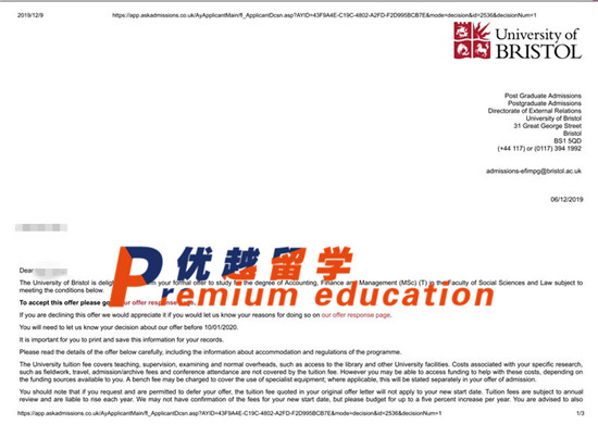 2020offer:恭喜汤同学获得布里斯托大学(世界排名:49)会计、金融与管理专业硕士通知书