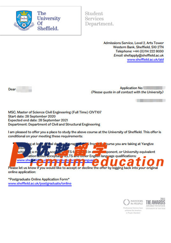 2020offer:恭喜刘同学获得谢菲尔德大学(世界排名:78)土木工程硕士专业通知书