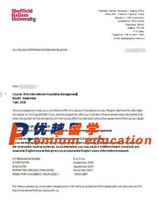 2020offer:恭喜于同学获得谢菲尔德大学(世界排名:78)国际酒店管理专业通知书