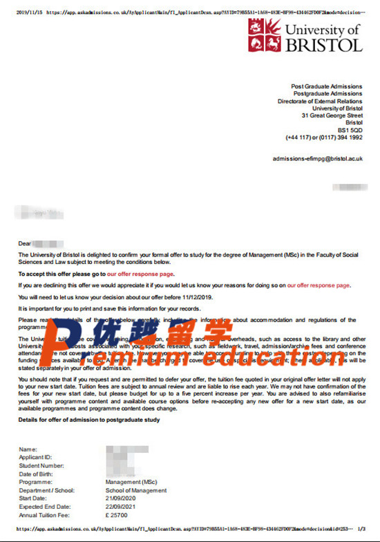 2020offer:恭喜李同学获得布里斯托大学(世界排名:49)管理学专业硕士通知书