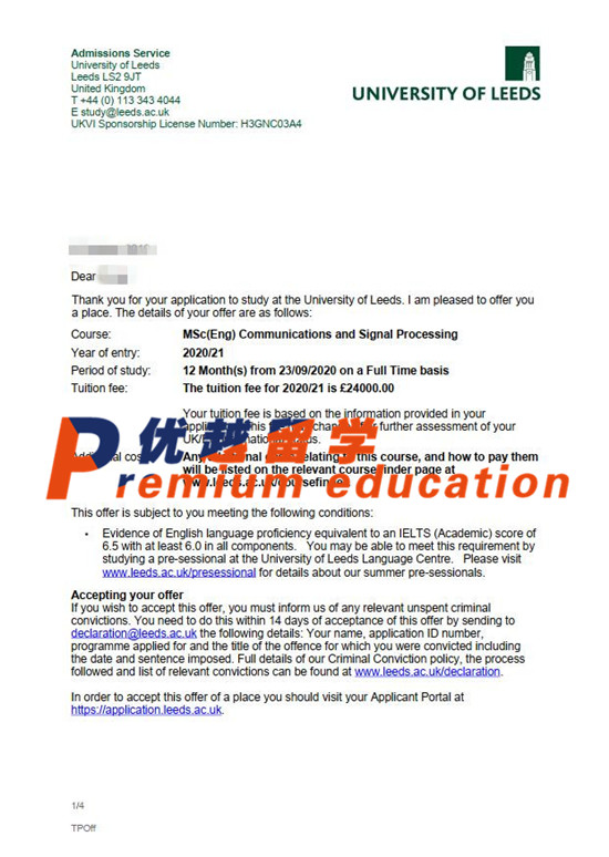 2020offer:恭喜孟同学获得利兹大学(世界排名:93)通信和信号处理专业硕士通知书