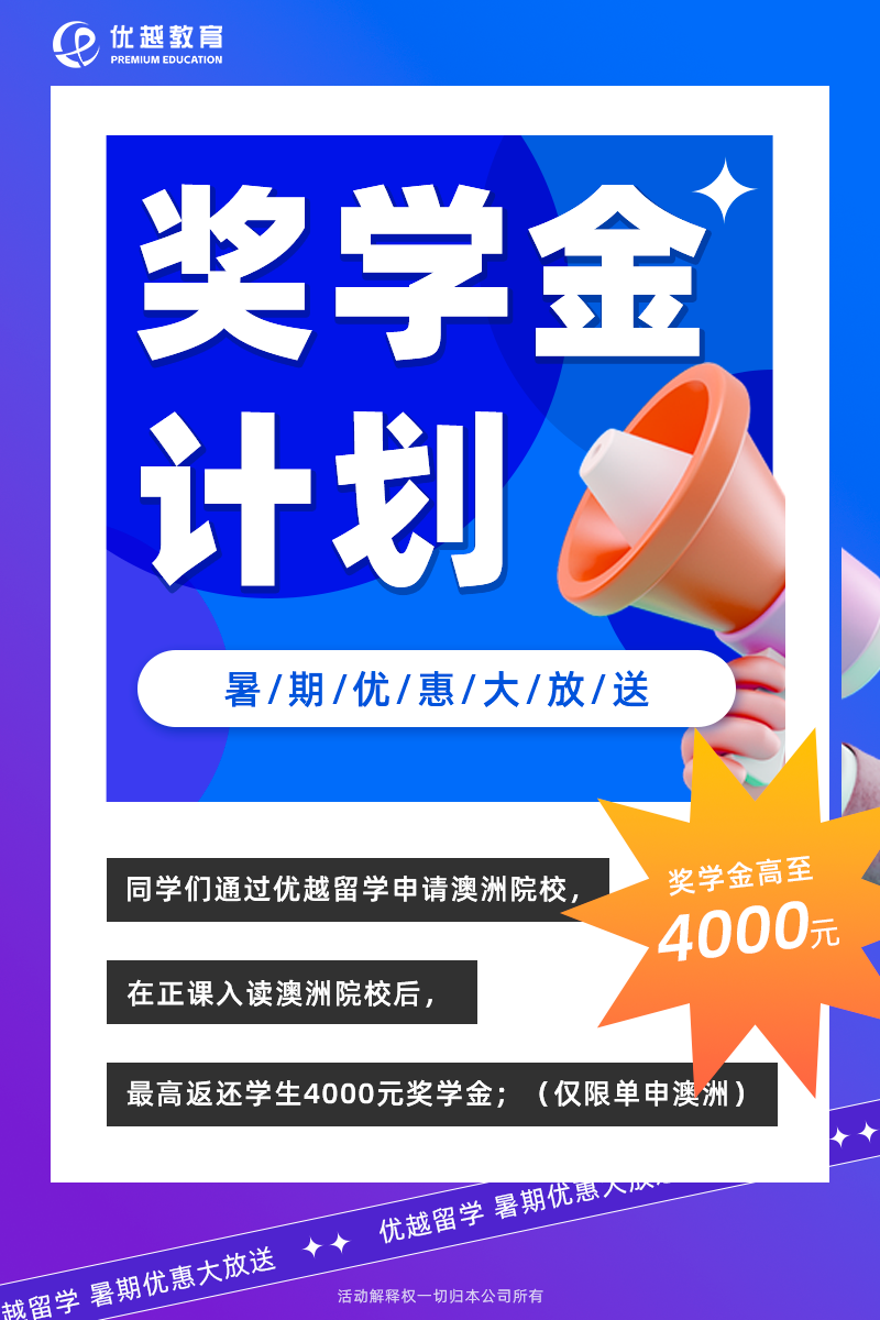 在特定期间内,通过优越留学申请澳洲院校,并在正式入读后,将有机会获得一笔奖学金,最高可达4000元!这一优惠仅适用于单申澳洲硕士项目的学生。